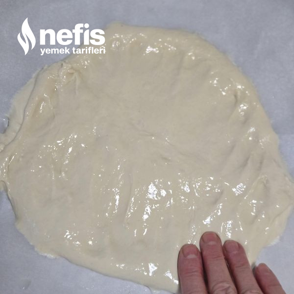 4. Mayalanan hamurun havasını alıp pişirme kağıdı serili tepsiye dökün dilerseniz hamuru dökmeden evvel mısır unu serpebilirsiniz elinizi hafif yağlayıp ortasından kenara yanlışsız bastırarak tepsi ölçüsüne nazaran genişletin, benim tepsi ölçüsü 35 cm yanlardan 1,5 cm kadar boşluklar kaldı yani 33_34 cm çapında bir pizza oluyor hamurun kenarlarını ortasına nazaran hafif kalın bırakın.