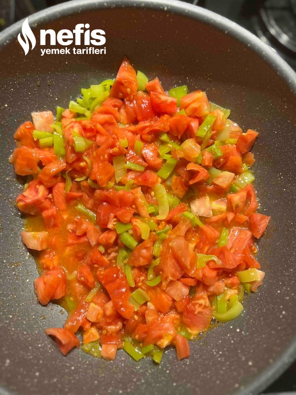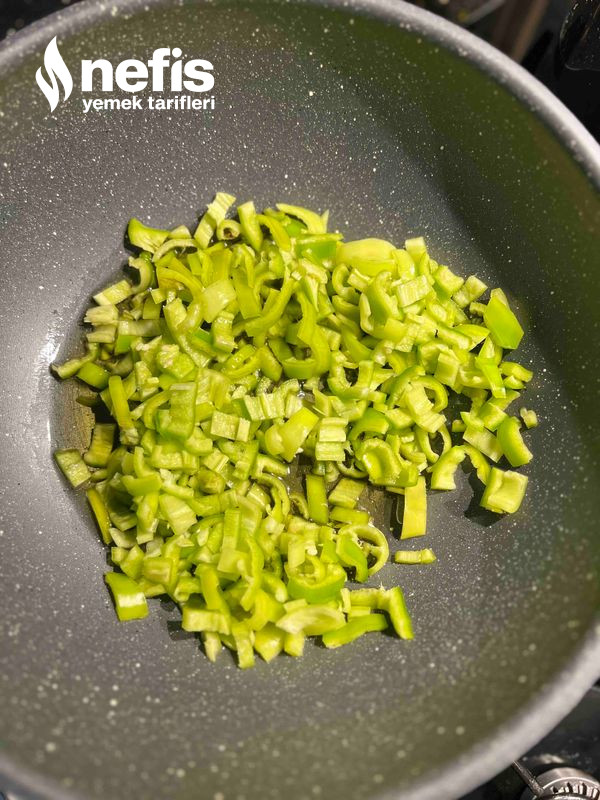 - Tencereye yağ ve yeşil biberi koyup kavuralım, akabinde domatesleri soyup, küp küp doğrayıp ekleyelim.