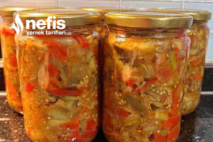 - Domates suyunu çekince kenara ayırdığımız patlıcan ve biberi ekleyelim. 10 dakika da o denli pişirdikten sonra sıcak sıcak kavanozlara koyup ağzını kapatalım.