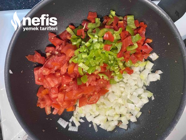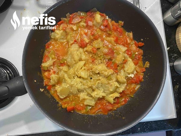 - Soğan, biberler, domates, sarımsak ve közlediğimiz patlıcanı tava alıyoruz ve 10 dakika pişiriyoruz ve bir kaseye alıyoruz.