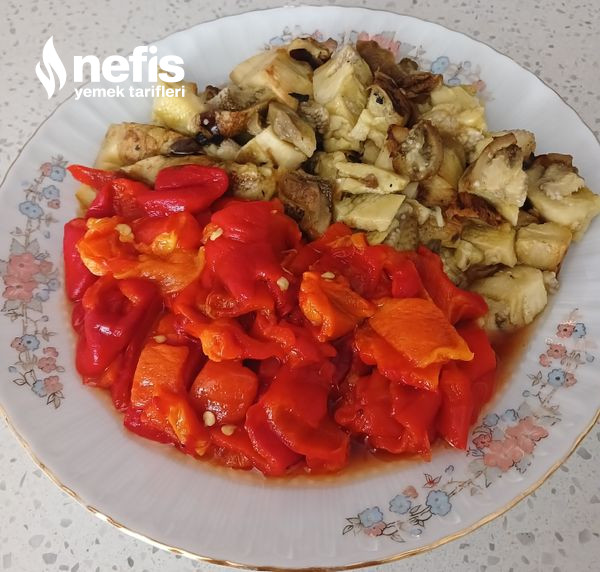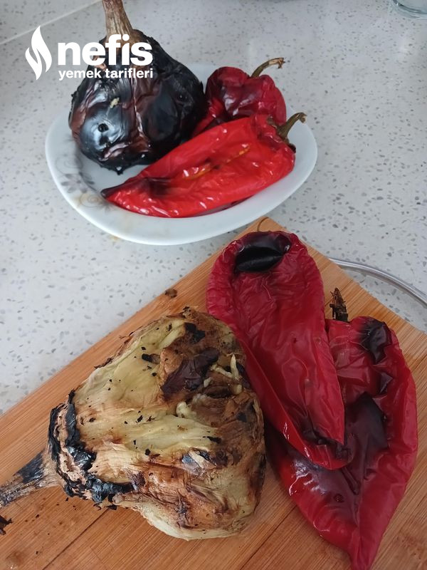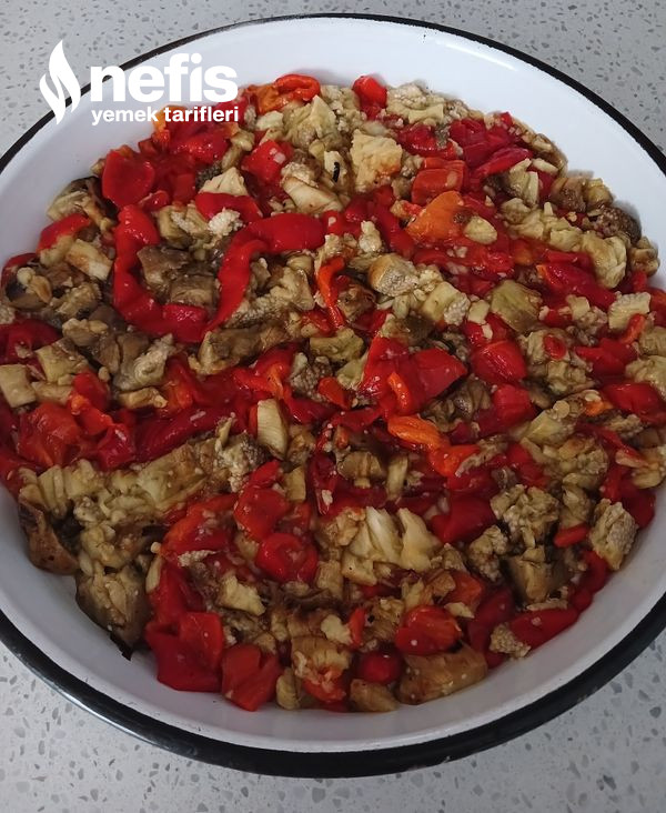 - Öncelikle patlıcan ve kapya biberler közlenir. İster fırında isterseniz de ocağınızın üstünde yapabilirsiniz. Közlenen patlıcan ve biberlerin kabukları soyulup çok küçük olmayacak biçimde doğranır. Biraz tuz ve biraz karabiber eklenip karıştırılır.