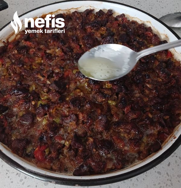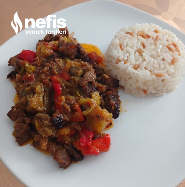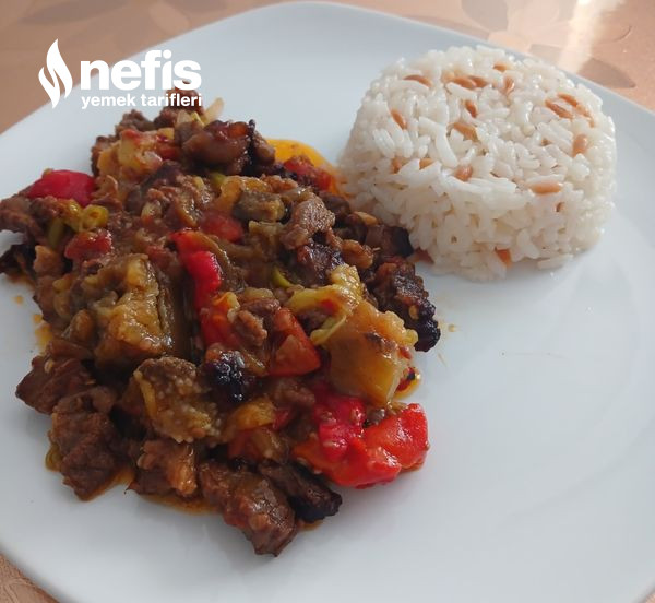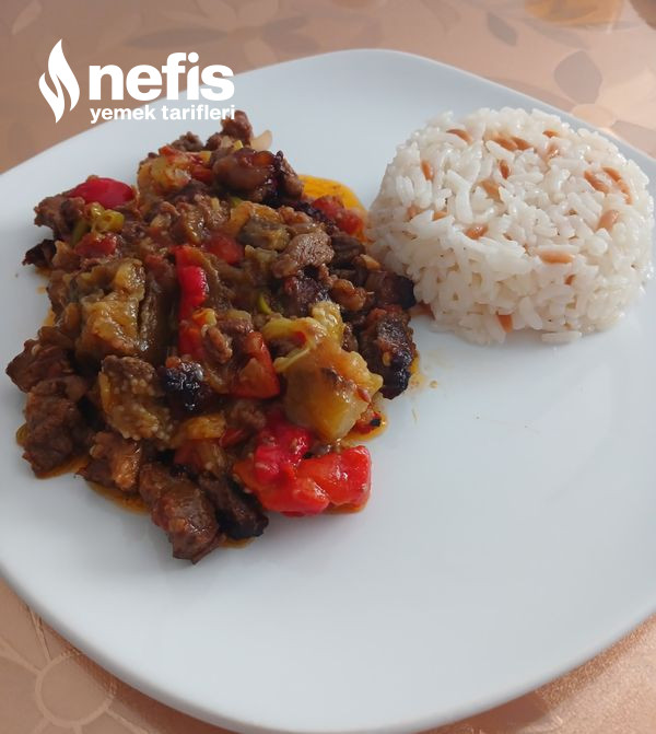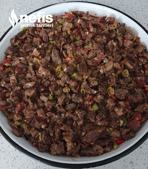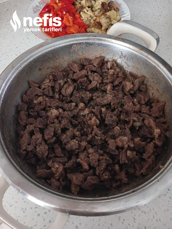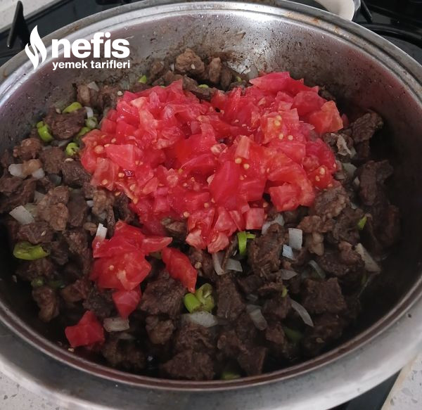 - Kırmızı et küp küp doğranıp pişirilir üzerine soğan biber sarımsak eklenip 5-6 dakika sotelenir. Daha sonra kabukları soyulup küp küp doğranan domatesler eklenir bir 5 dakikada o formda pişirilip ocaktan alınır.