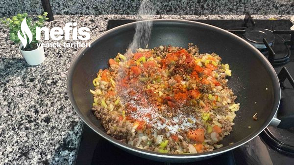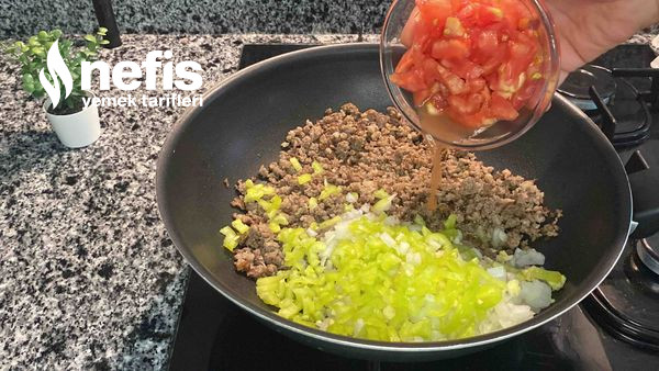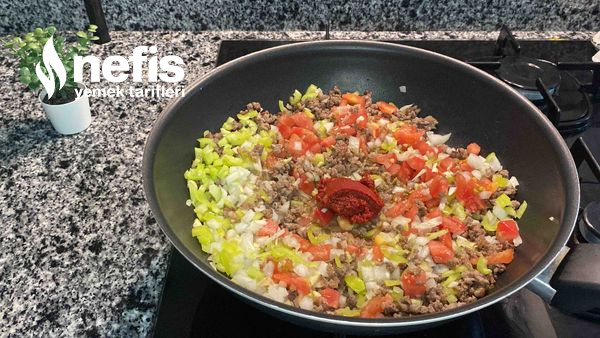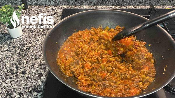 2. Kıymayı tavada kavuralım üzerine sıvı yağ koyup karıştıralım. Yemeklik doğradığımız kuru soğan sivri biber domatesi sarımsağı ve salçayı baharatlarını ek edip karıştıralım. Bir çay bardağı suyunu katıp bir taşım kaynatıp ocağın üzerine indirelim.