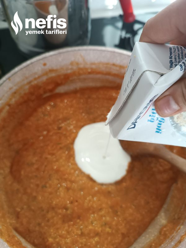 - Pişen sosumuzun içerisine bir paket kremayı ve kaşarı ekleyip 2 dk daha karıştırarak pişirelim.