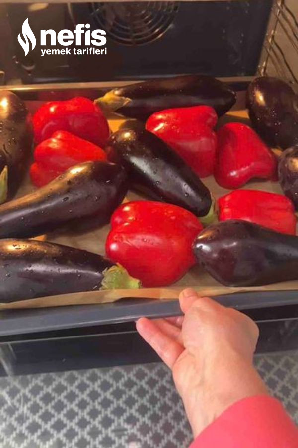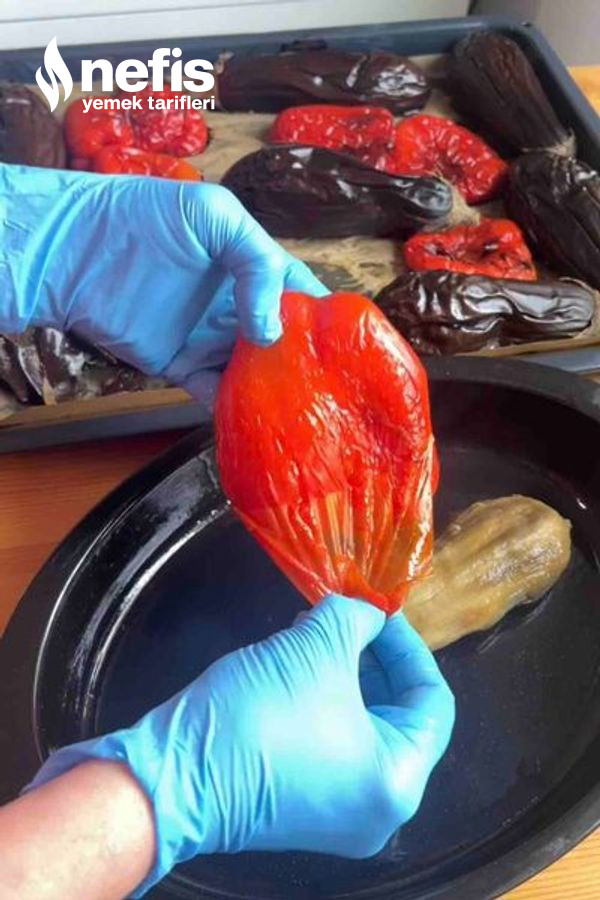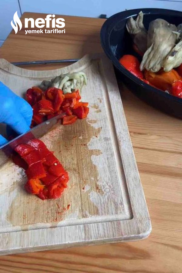 3. Patlıcanları ve kırmızı biberleri 200 dereceli fırında közleyip kabuklarını soyun, irice doğrayın.