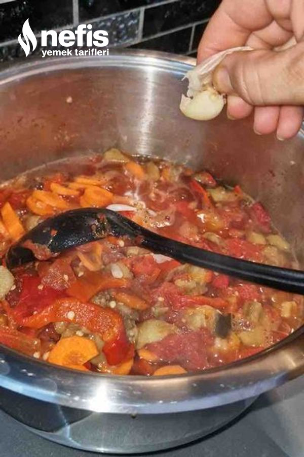 - Fırından çıkartıp soğuyan sebzelerin kabuklarını soyup doğrayın,pişen domateslerin üzerine ekleyin birlikte pissinler,sarımsakları da ek edin.