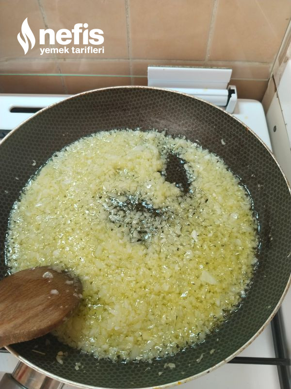 - Bir adet soğan ve bir diş sarımsak rondodan yahut rendeden geçirilerek zeytinyağında kavrulur.