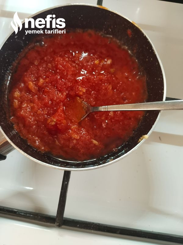 - Küçük bir kapta sarımsak ve domates sosunu kavuruyoruz.