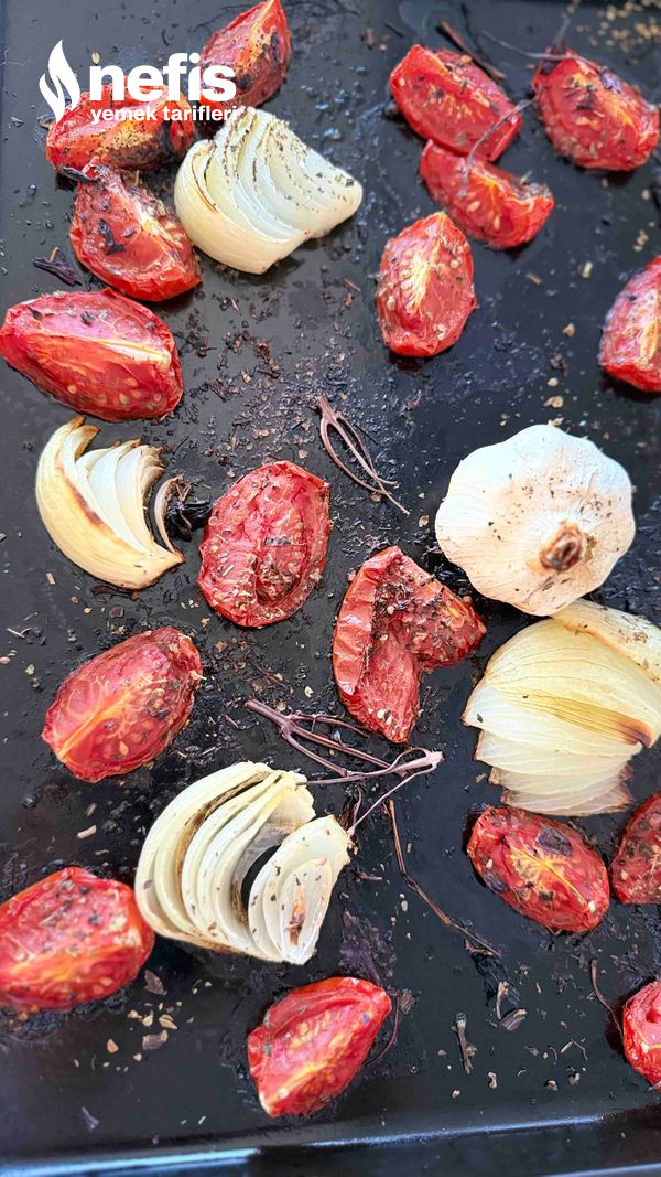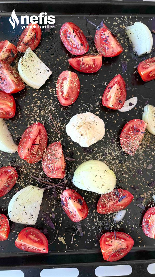 - İri kesilmiş domates, kuru soğan ve sarımsağı fırın tepsisine dizin. Üzerine zeytinyağ ve baharatları gezdirin.