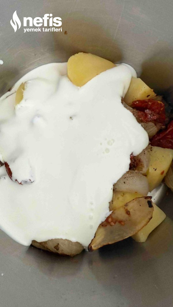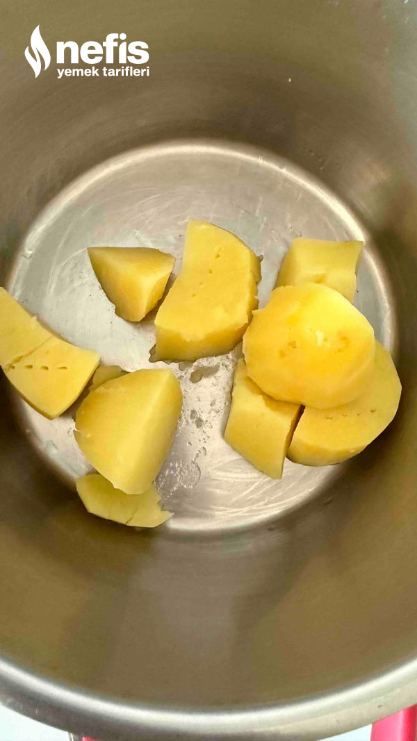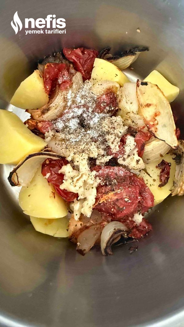 - Fırından alın be bir tencereye ekleyin, (sarımsağın kabuğunu temizleyin ) patates, krema ve suyu tencereye ekleyin ve blenderden geçirin. Ocağa alın kaynatın.