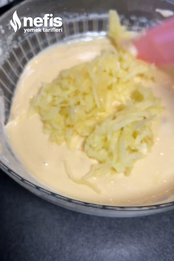 - Un ,kabartma tozu ve vanilyayı eleyerek karıştırın, hamurun içine bir adet rendelenmiş elmayı ekleyip bir spatula yardımıyla karıştırın.