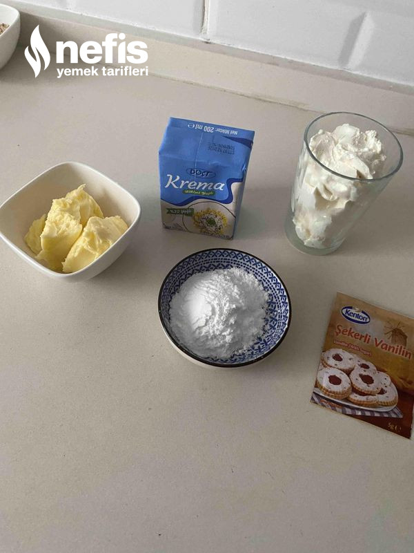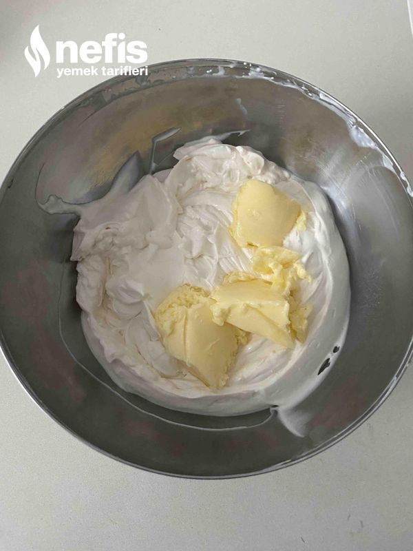 - Kremayı hazırlayalım. Tüm gereçleri ( tereyağ hariç) mikser ile güzelce köpürt sonra oda sıcaklığında olan tereyağı ekle ve çırp.