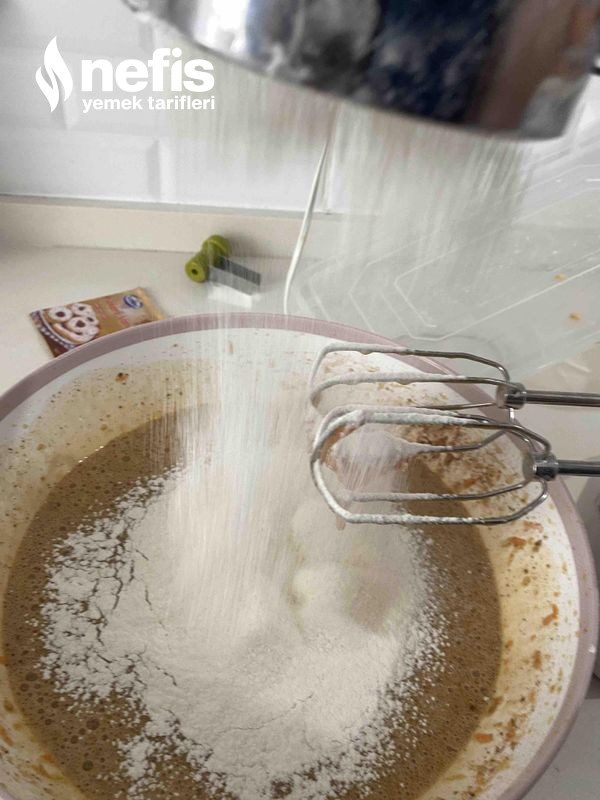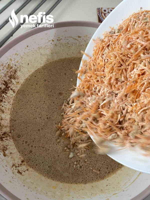 - Sonra havuçlu cevizli karışımı ekle. Sonra baharatları ekle ( tarçın, zencefil, tuz, karbonat).