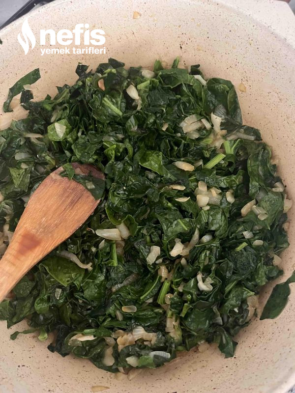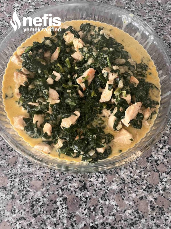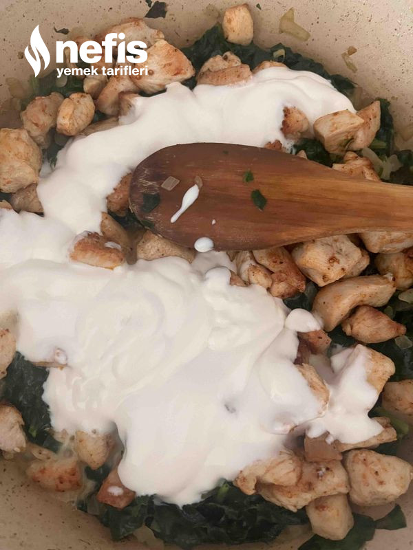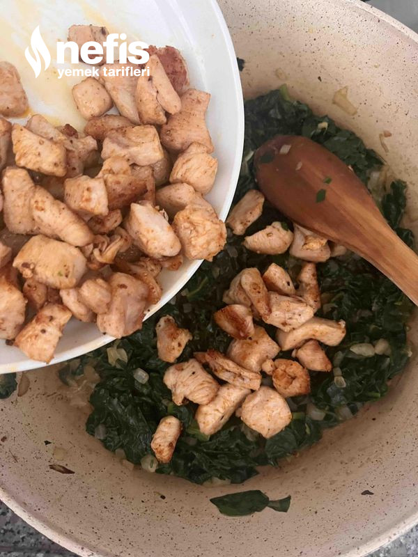 3. Ardından yıkanan doğranan ıspanaklar eklenir, ıspanak suyunu bırakıp çektikten sonra sotelenen tavuklar bu karışıma eklenir.