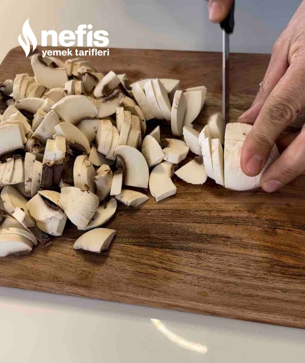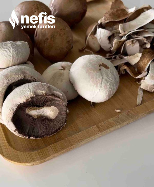 1. mantarların kök kısımlarını çıkarıp kenarlarının kabuklarını soyun ( asla yıkamıyoruz ) ortadan ikiye bölüp ince doğrayın.