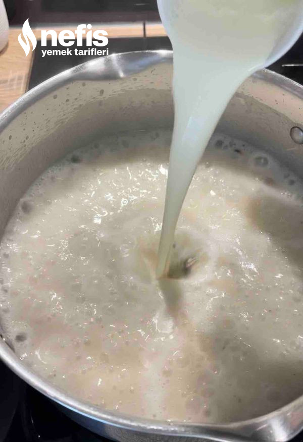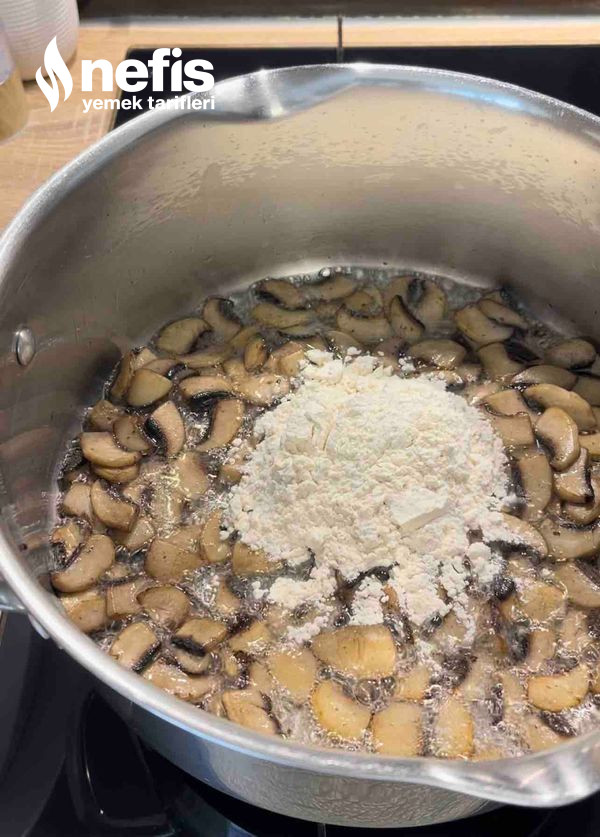 3. Mantarlar kavrulduktan sonra üzerine unu ek edin. Daima karıştırarak unun kokusu çıkana kadar 2-3 dakika kavurun. Üzerine yavaş yavaş 1 litre sıcak suyu ek edin. Topaklanmaması için karıştırmaya devam edin.