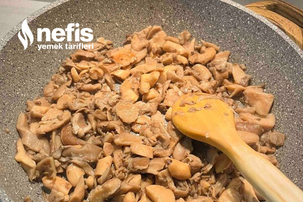 - Aynı tavaya yağı alın ve kızınca doğranmış sarımsağı koyun ve kokusu gelmeye başlayınca mantarları ekleyin.
