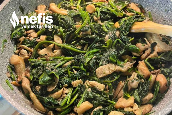 - Mantarlar pişince evvelce hazırlanan ıspanağı da ekleyin ve birlikte 10 dakika pişirin.