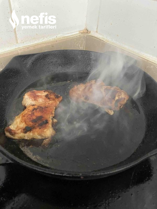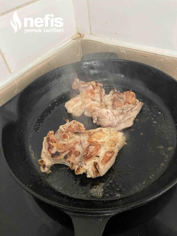 - Kızgın tavada (ben döküm tavada yaptım) tavuklarımızı güzelce kızarta kızarta pişirelim.