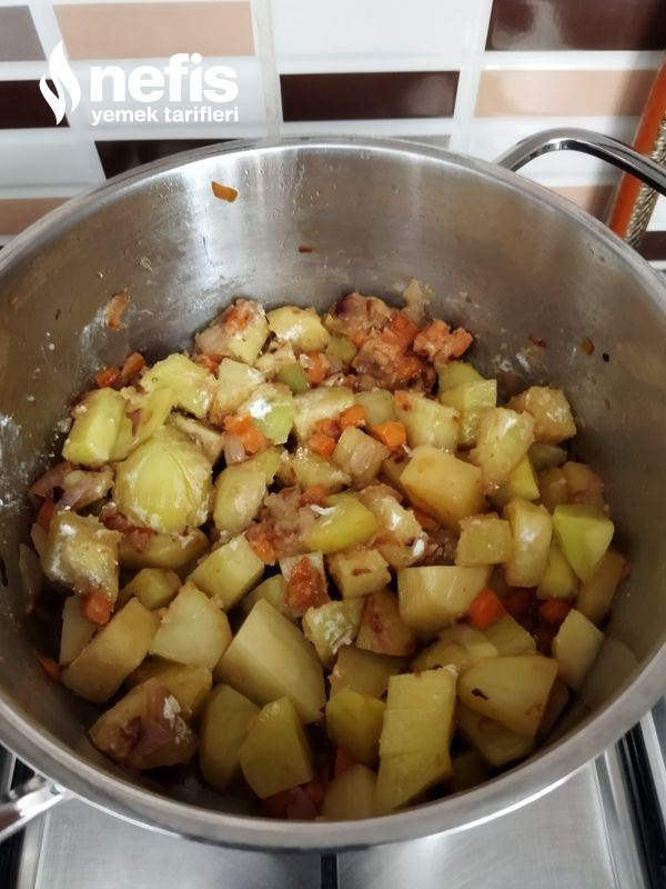 2. Patatesleri soyup yıkayıp orta büyüklükte küp doğrayalım ve kavurmaya dahil edip devam edelim.