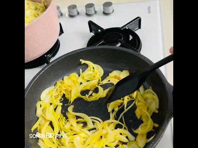3. Aynı tavanın içerisine 1 yemek kaşığı tereyağı ve 1 yemek kaşığı sıvı yağ ekliyoruz. Piyazlık doğradığımız (ya da isterseniz küp küp) soğanları ekleyip, karamelize olana kadar güzelce kavuruyoruz.