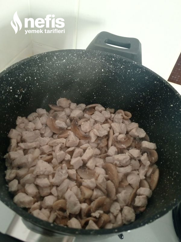 - Suyunu çeken tavukların üzerine kabuğunu soyup, ince ince doğradığınız mantarları ekleyip 5 dakika daha pişirin.