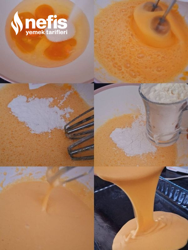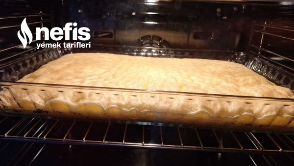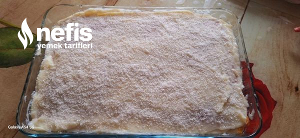 - Hazır olan hamuru yağlanmış borcama döküp her tarafı eşit olacak halde düzeltelim. (ben bu biçimde yaptım lakin borcamdan çıkarırken biraz zorlandım size tavsiyem yağlı kağıt serip üzerine dökmeniz şayet yağlı kağıdınız yoksa a4 kağıdından iki tane yan yana gelecek formda borcama serip 3-4 yemek kaşığı sıvı yağ döküp her tarafına gelecek formda sürüp kullanabilirsiniz).