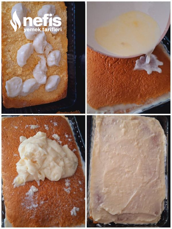 - Ardından kremanın üzerine keki örtüp kalan sütü dökelim.