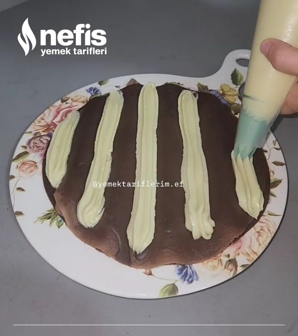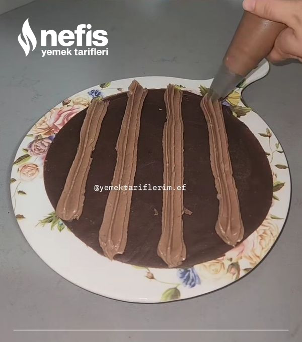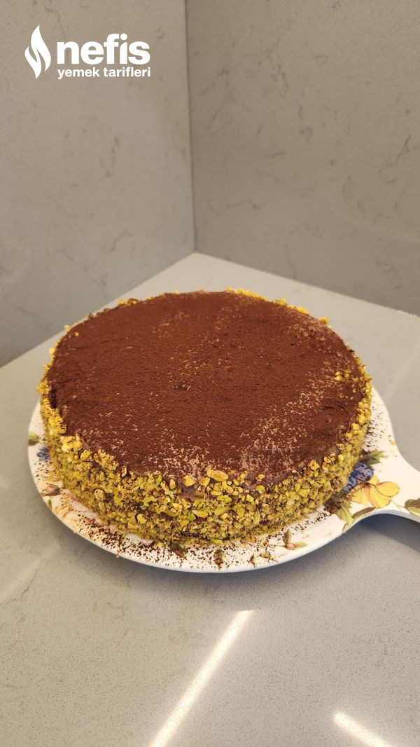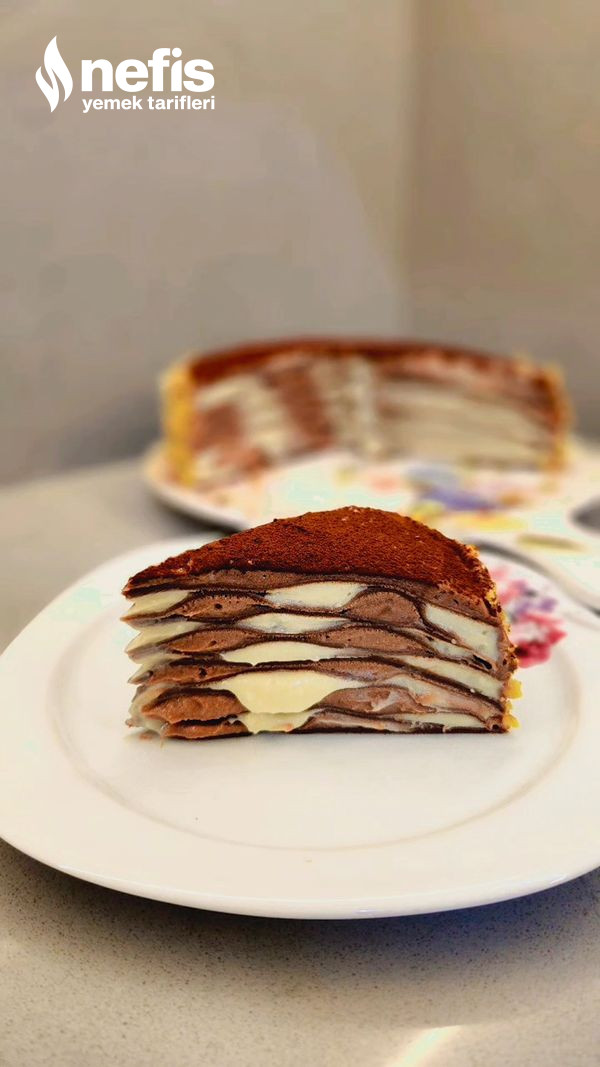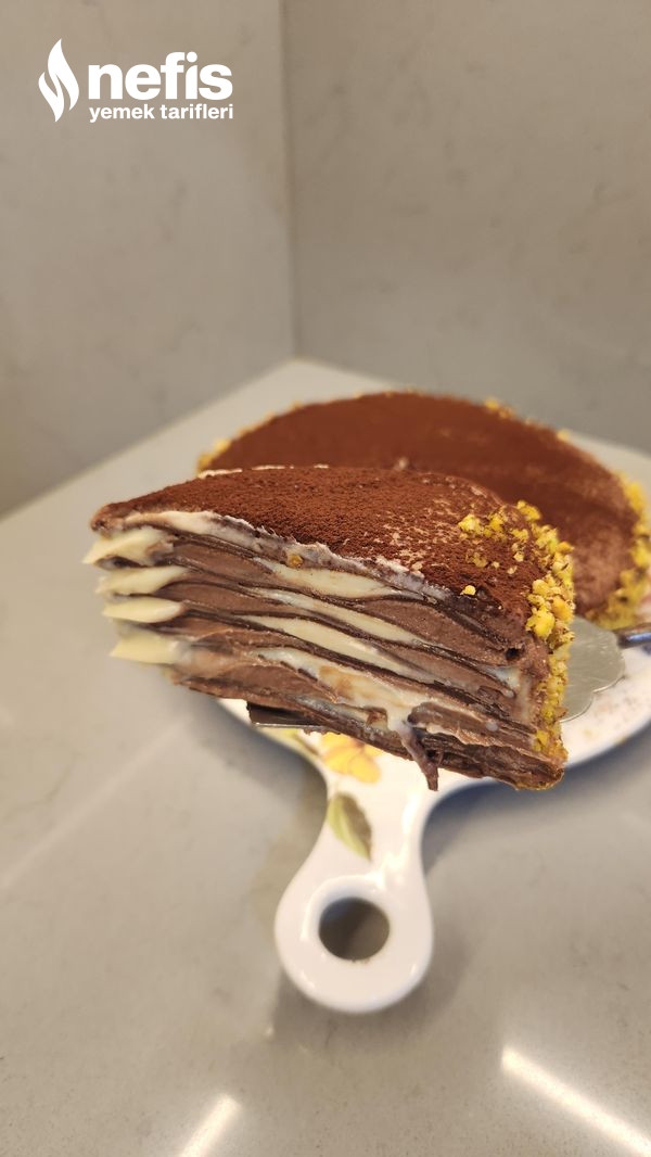 - Krepler pişince kenar kısımlarını kesip bir kata çikolatalı krema, bir kata fıstıklı krema koyarak pastamızı hazırlayalım.