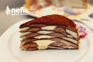 - Krepler pişince kenar kısımlarını kesip bir kata çikolatalı krema, bir kata fıstıklı krema koyarak pastamızı hazırlayalım.