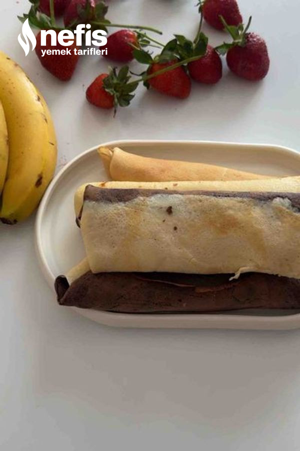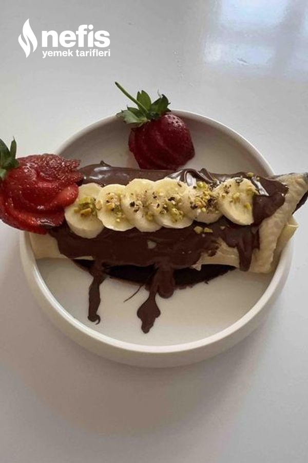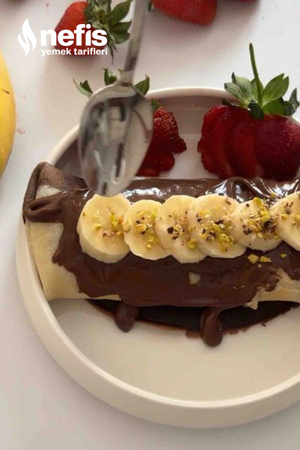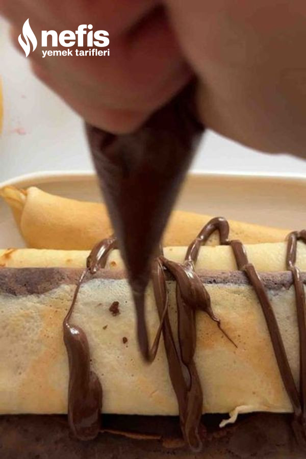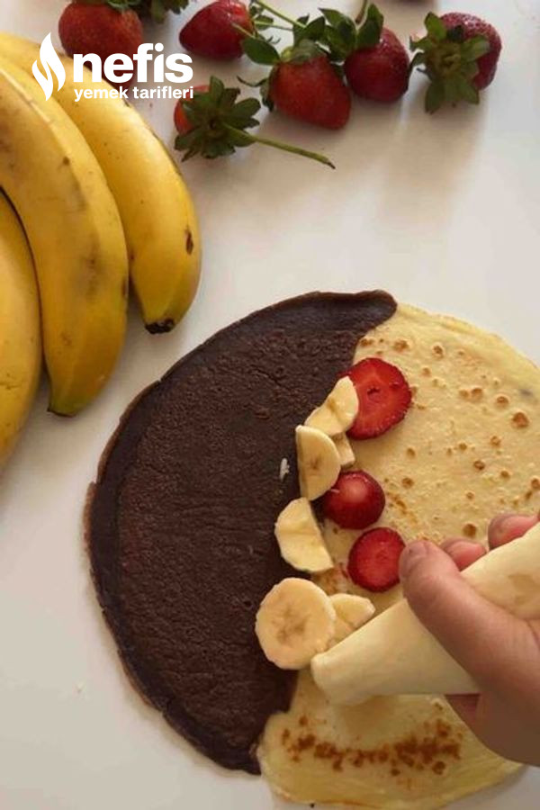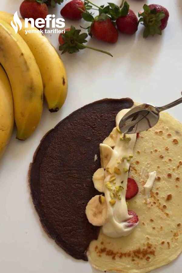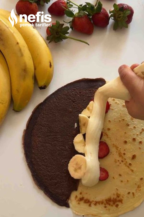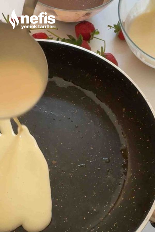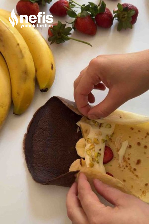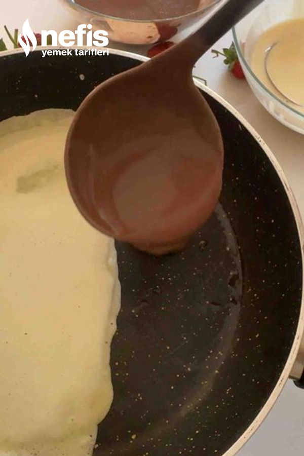 7. Bütün krepler piştikten sonra muhallebimizi mikserle en az 3 dakika boyunca çırpalım ,daha sonra krebin içine evvel meyveleri, sonra kremayı ve şayet varsa antepfıstığı koyup evvel kenarlarını katlayıp daha sonra saralım .