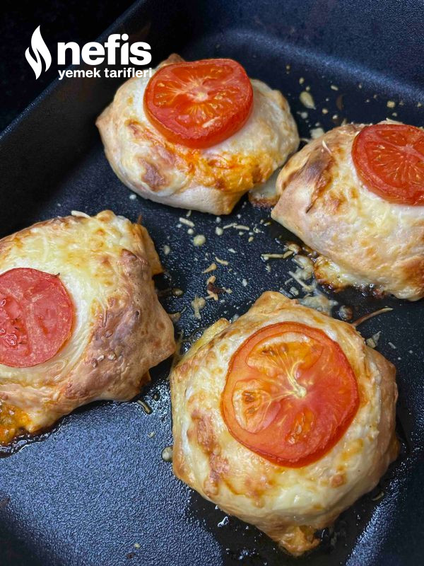- Kaşar peyniri serpin ve domates dilimleri yerleştirin.