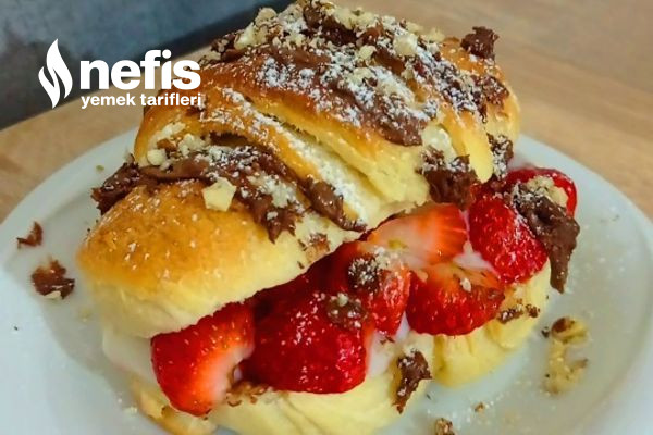 - Daha sonra kremamızı ve dilimlediğimiz çilekleri katalım ve üzerine benmari adabı eritilmiş olan çikolatayı kuruvasanların üzerine gezdirelim.