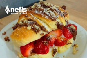 - Daha sonra kremamızı ve dilimlediğimiz çilekleri katalım ve üzerine benmari adabı eritilmiş olan çikolatayı kuruvasanların üzerine gezdirelim.