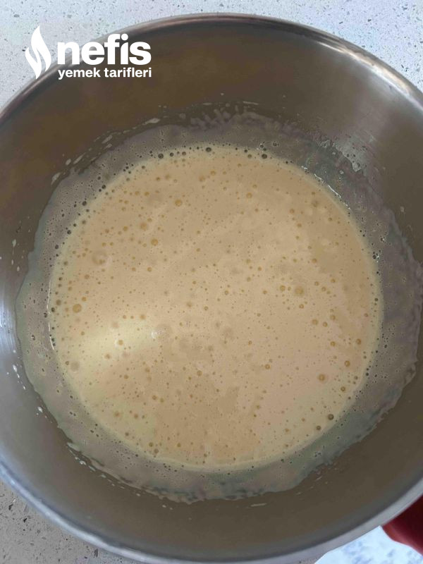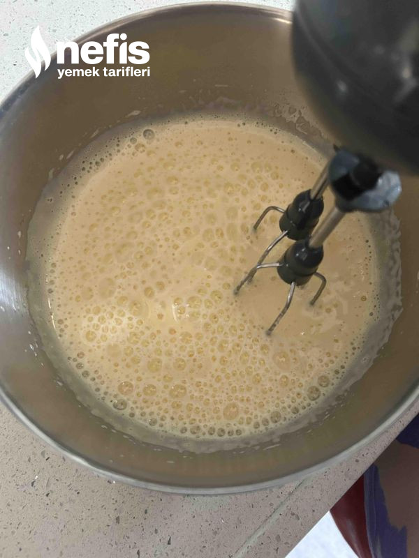 - Beyazlaşan karışıma süt ve sıvı yağ eklenir, çırpılmaya devam edilir.