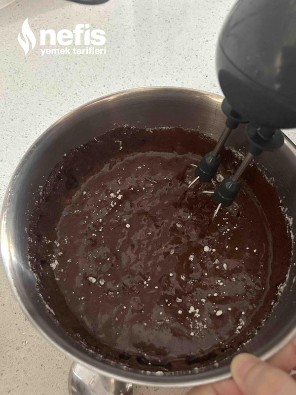 - Üzerine un, kakao, şekerli vanilin ve kabartma yozu eklenip homojen bir kıvam alana kadar çırpılmaya devam edilir.