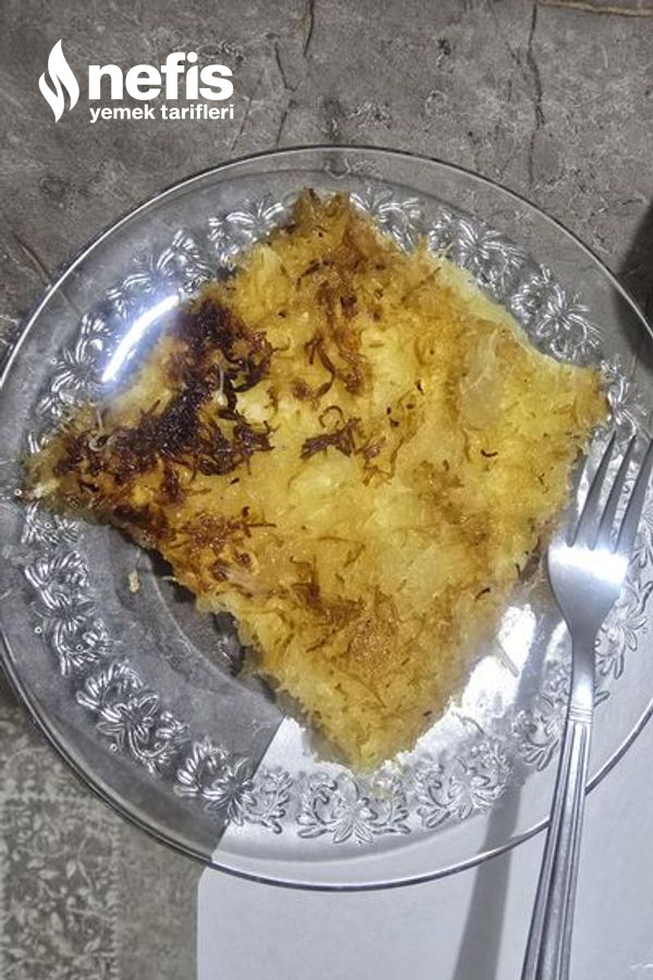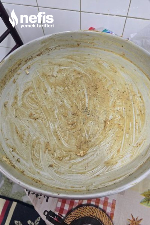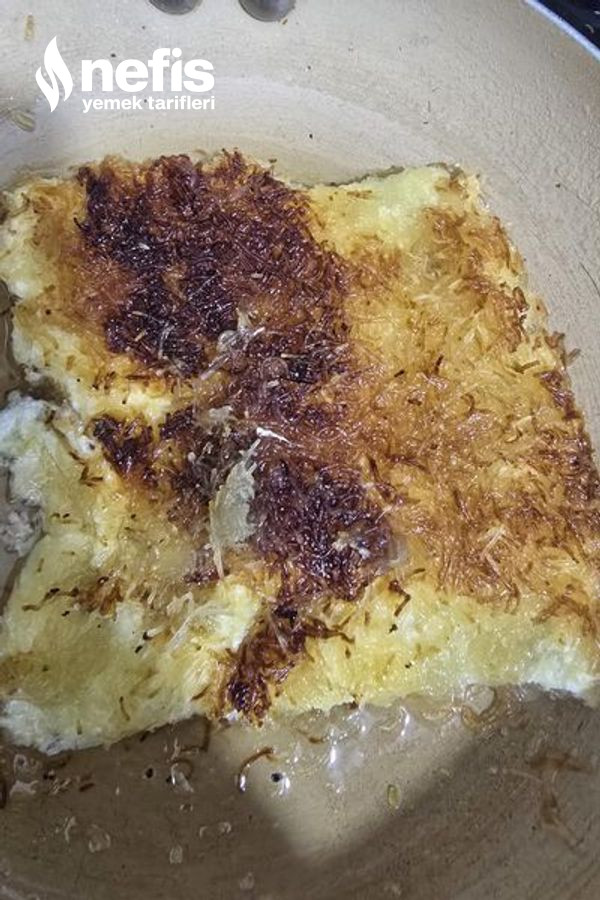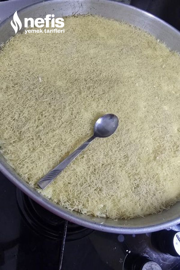 - Diğer tarafı içinde tekrar 1yemek kaşığı tereyağı ve 1 yemek kaşığı pekmez tepsiye sürülür künefeyi tepsiye yanlışsız koyup tekrar çevire çevire pişirelim.