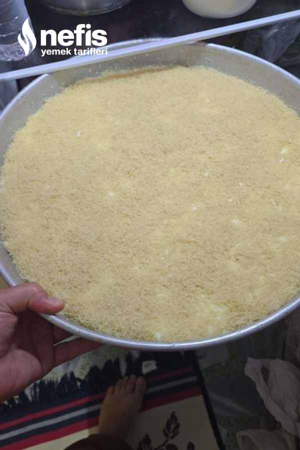 - Kadayıfın yarısı tepsiye yayılıp düzlenir.
