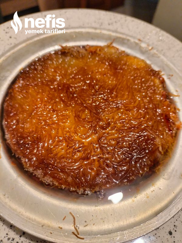- Künefeyi tekrar pişmemiş kısmı alta gelecek formda tabağa alın ve pişirme sürecini tekrarlayın.
