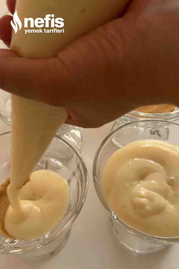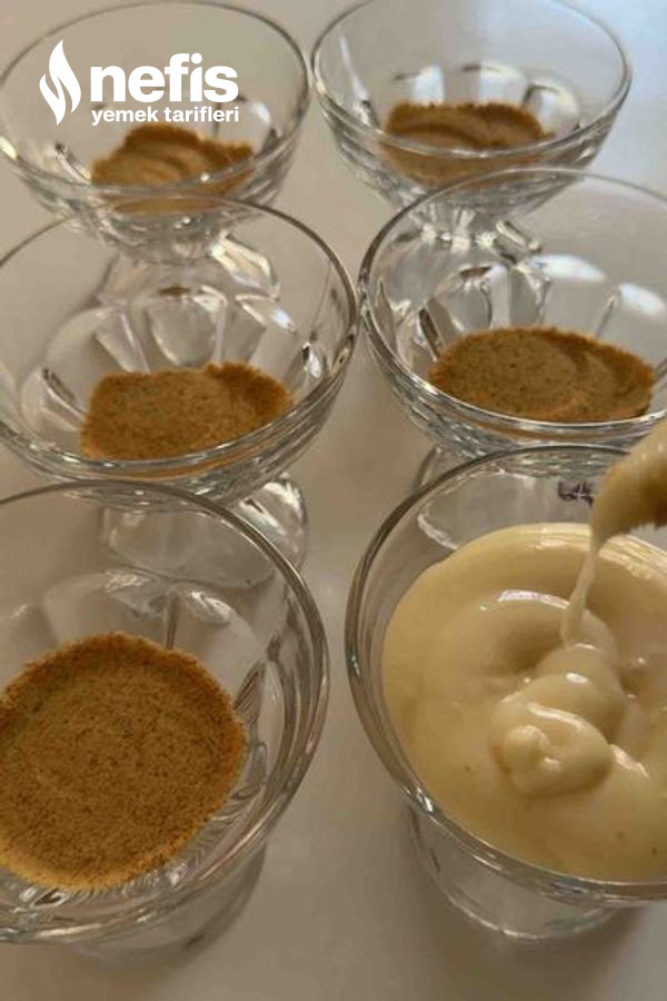 - Alt taban için bisküvileri ve çerezleri rondodan geçirelim ve kupların altına yerleştirelim soğuyan muhallebiyi düzgünce çırptıktan sonra üzerine dökelim.