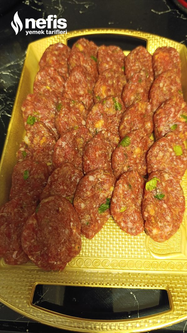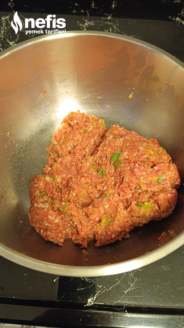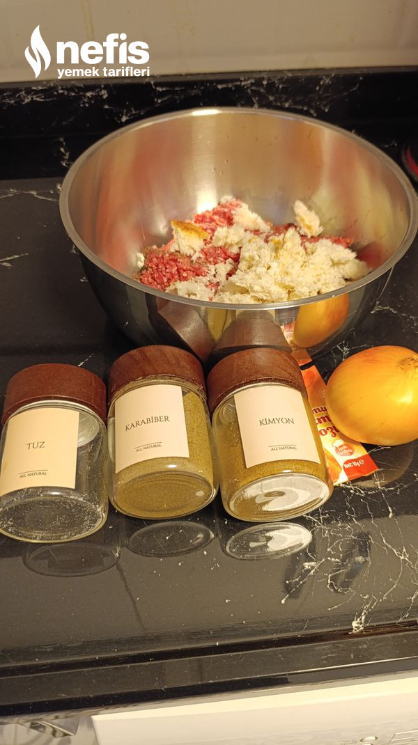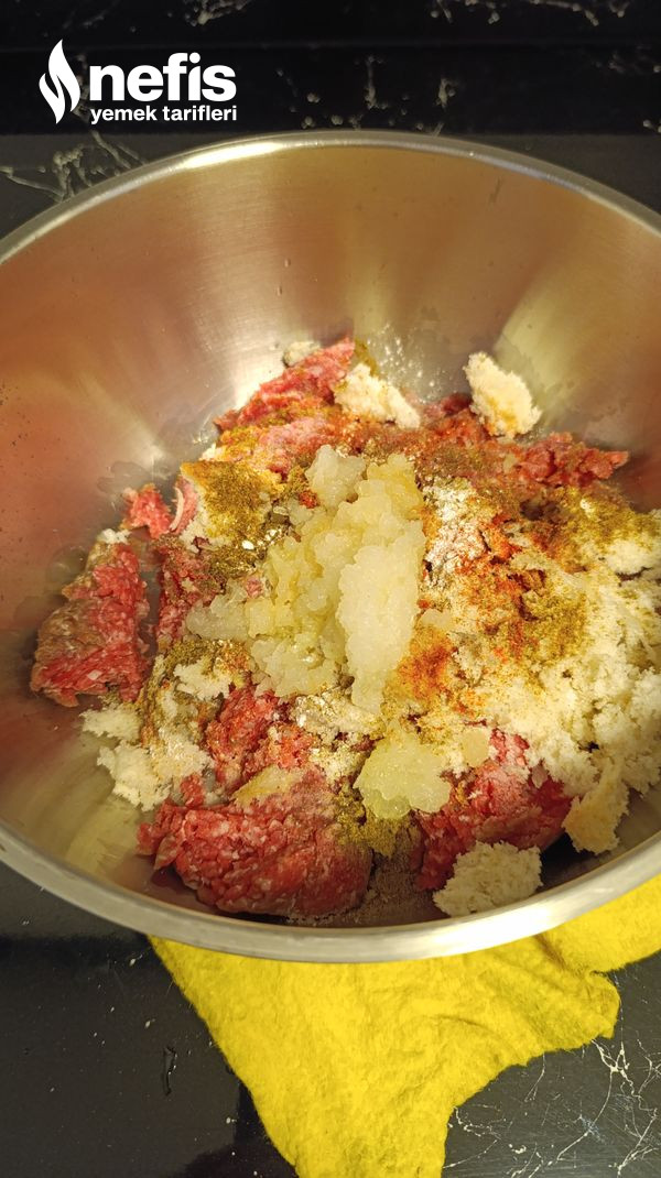 - Derin bir kaba kıymayı alıp üzerine yarım bayat ekmek içini rendelenmiş kuru soğanı, kabartma tozunu, tuz ve baharatları da ekleyerek yoğuruyoruz. Şekillendiriyoruz.