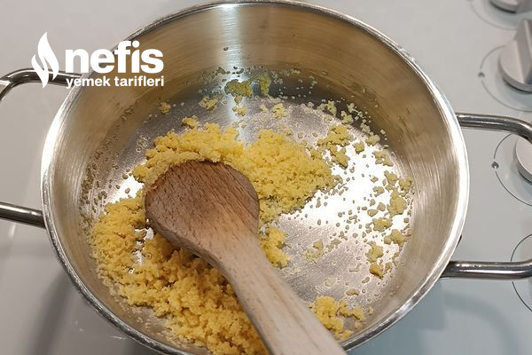 - İlk olarak tereyağ ve zeytinyağımı ocağa koyup eriyince içerisine irmiğimizi ek edip kısık ateş de 10 dakika kadar kavuruyoruz.