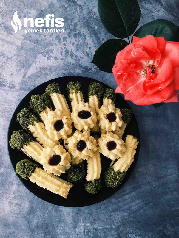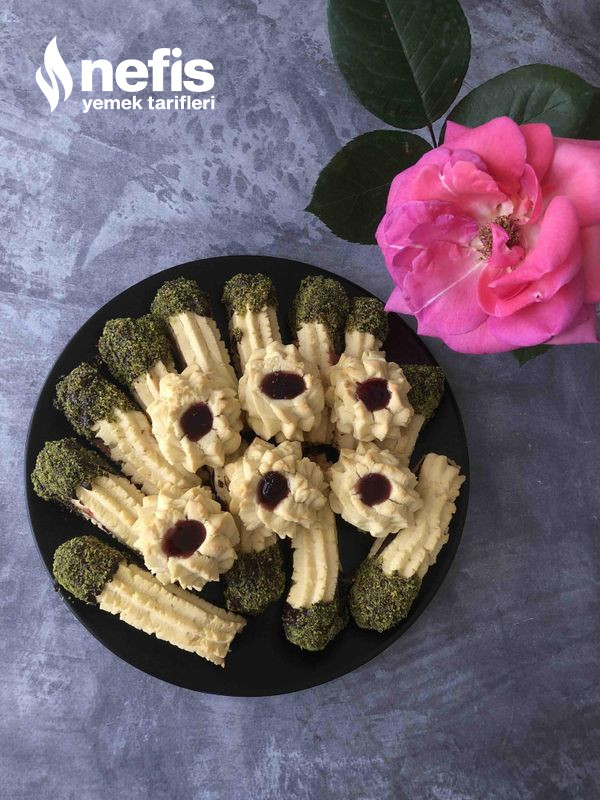 - Kurabiyeler soğuyunca mermela sürüp kapatalım ,ucuna bitter çikolata batıralım ve toz fıstığı bulayalım. Afiyet olsun😊.