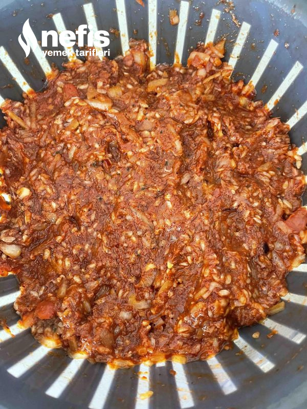 3. İç harcımız için evvelden yıkayıp 10 dk suda bekletmiş olduğumuz pirinçimizi karıştırma kabına alalım.