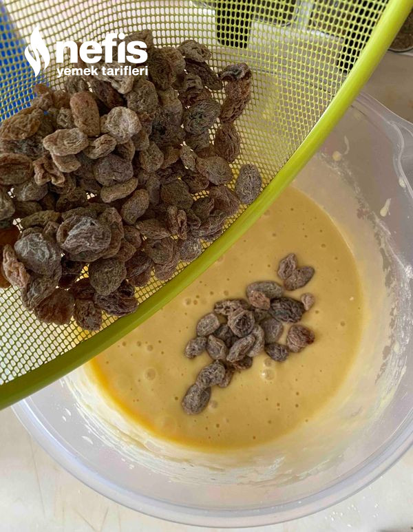 - Kuru üzümümüzü çok tabana batmasını istemiyorsak hafifçe un serpelim üzerine, karıştıralım ve harcımıza koyalım. Daha sonra bir kaşık yardımıyla hafifçe karıştıralım.