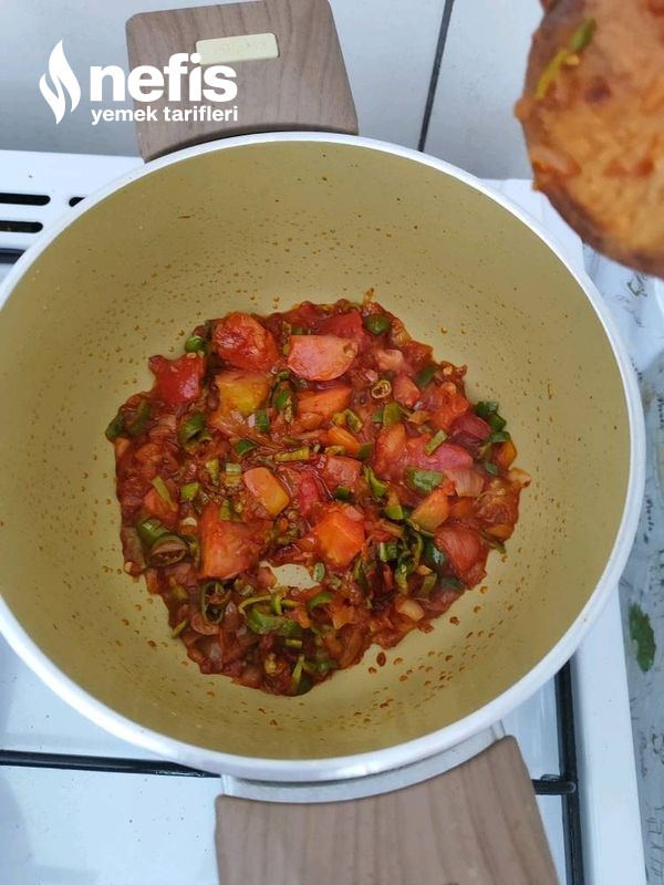 - Domates ve biberleri ekleyip biraz daha karıştırıyoruz.