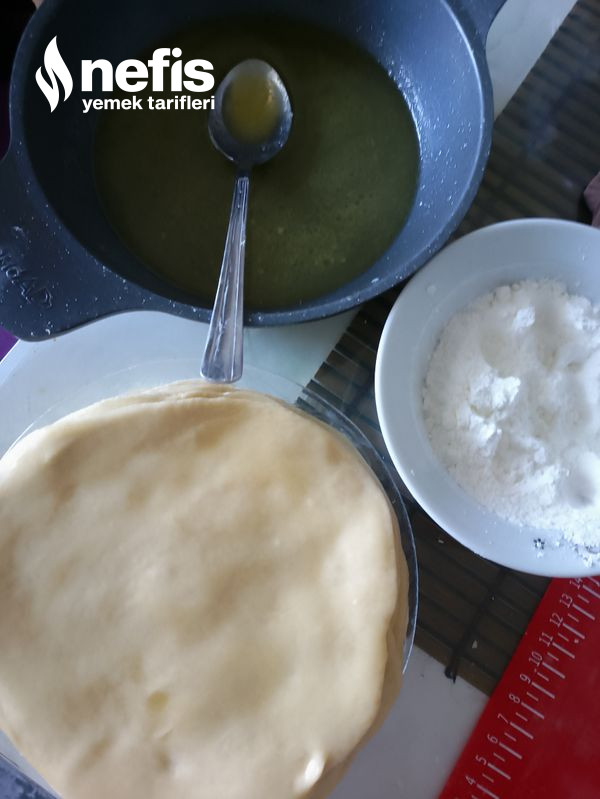 3. Dinlenen hamuru 14 eşit modüle bölüp bezeler haline getirelim. Birinci 7 parçayı bir tabak büyüklüğünde olacak biçimde nişastayla birlikte açalım her bir modüle eritilmiş yağdan sürüp üst üste koyalım. En üsttekine de yağ yüz sürüp bir streçle kapatalım.