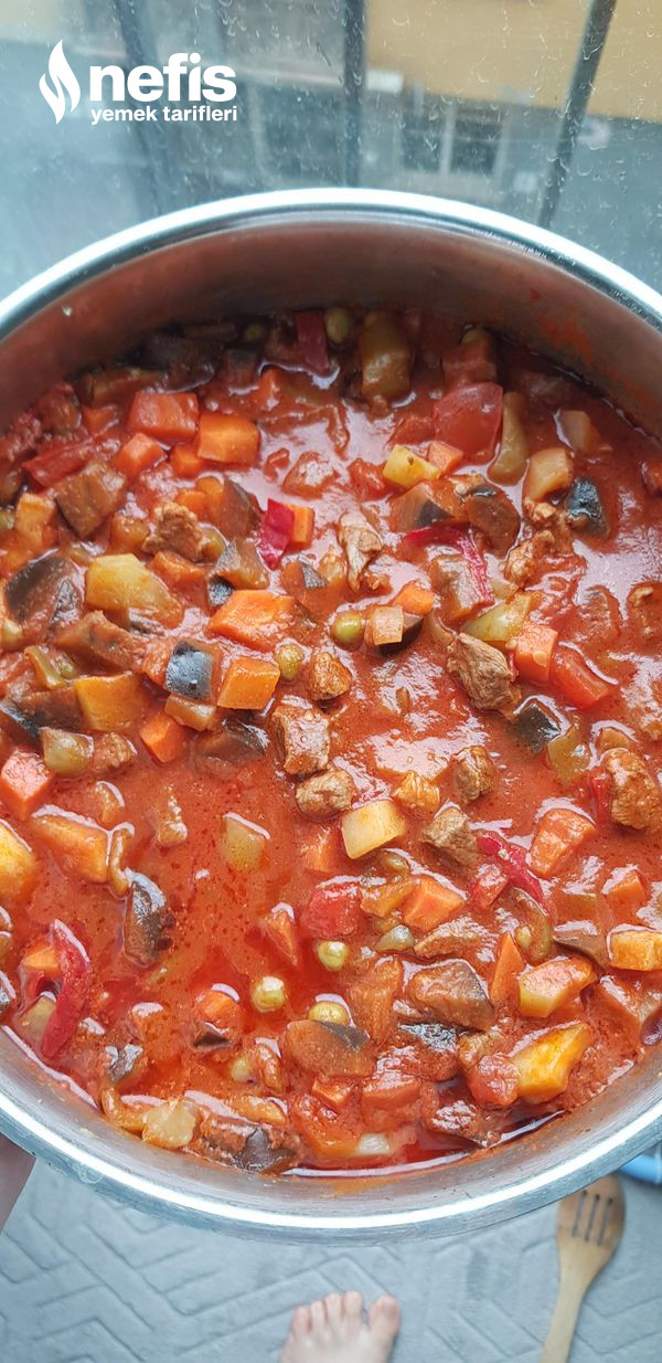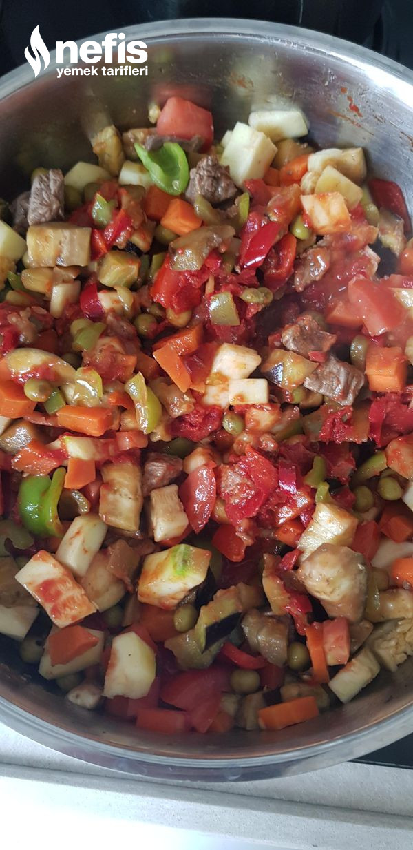 - Geniş bir tencerede yağı eritip soğanı kavurup, etini ekleyip, onu da kavurup sırayla havuç, patlıcan, kabak, kapya biber, sivri biber, bezelye, salça koyup kavurun.