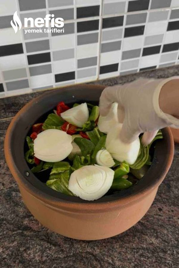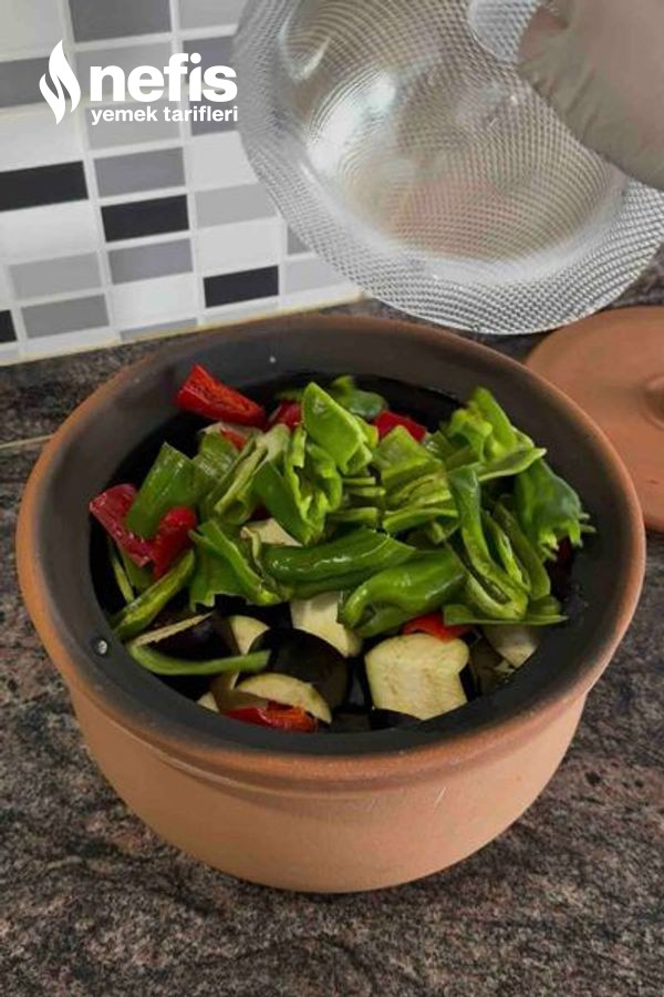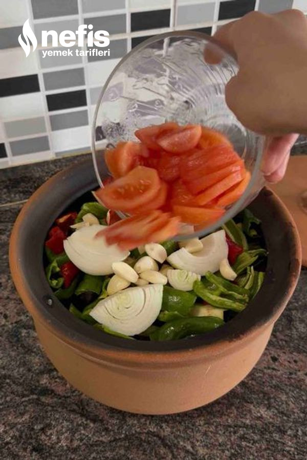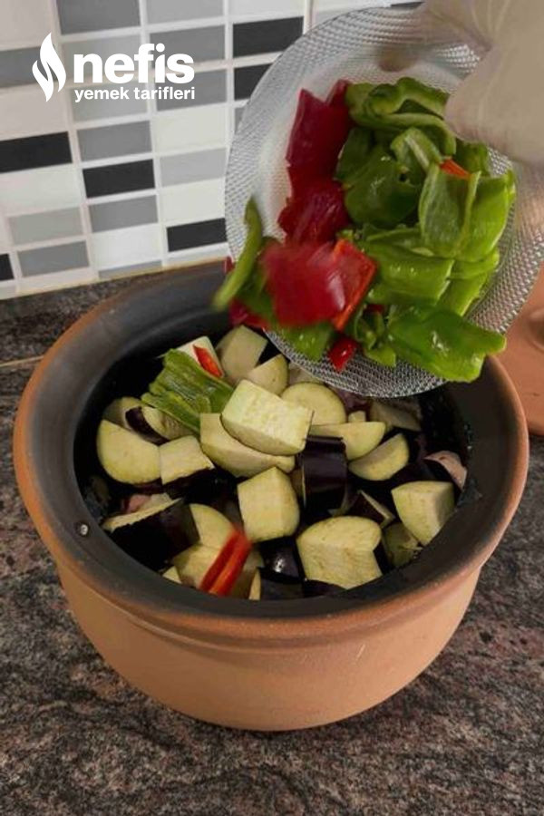 - Güvecin en altına etleri, sonra da sırasıyla patlıcan ,biber, soğan,sarımsak ve domatesi ekleyin.