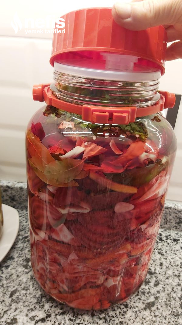 - En üstüne tuzu limon tuzunu, kişniş, karabiberi, sirke, defne yaprağını koyalım, içme suyunu ek edip kapağını kapatalım, 1 gece beklesin.